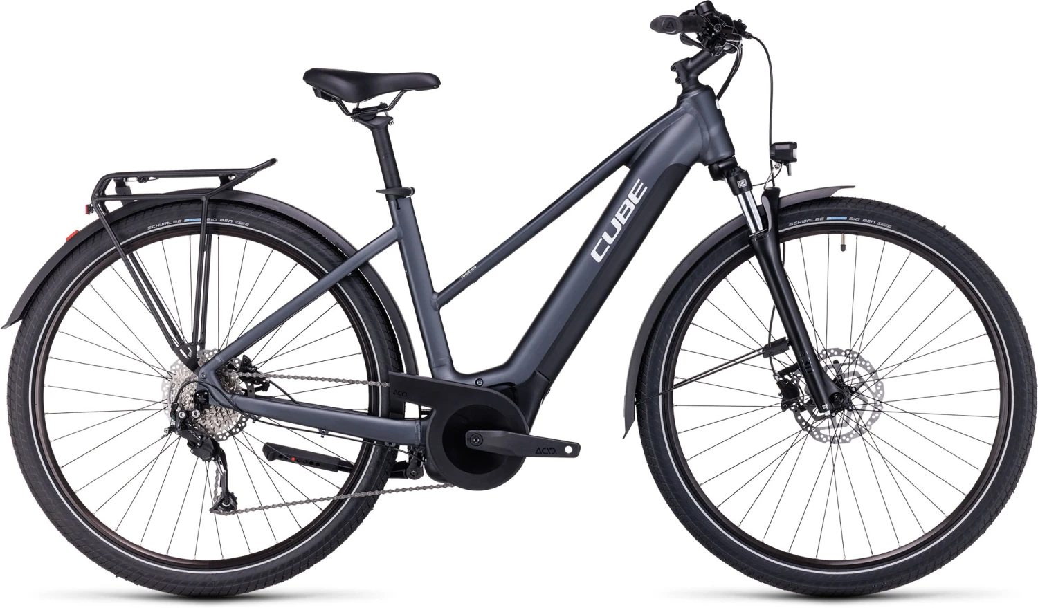 Bei der Entwicklung des Touring Hybrid standen Vielseitigkeit, einfaches Handling und hoher Fahrkomfort im Fokus. Somit habt Cube den leistungsstarken Bosch Performance Motor mit Bosch Smart System und den PowerTube Akku so formschön ins Rahmendesign integriert, dass es kaum auffällt. Was aber auffällt, ist der tolle Support im Vorwärts. Die überarbeitete Efficient Comfort Geometry sorgt gemeinsam mit der Federgabel mit 63 mm Federweg für ein komfortables und zugleich kontrolliertes Fahrgefühl, selbst auf holprigen Strecken. Auf dem Gepäckträger findet sämtliches Hab und Gut bequem Platz. Und in der Sattelklemme hat Cube ein praktisches Mini-Tool versteckt. Was noch? Ein neuer ACID Kettenschutz, ein Seitenständer und extralange Schutzbleche. Gut zu wissen: Den Rahmen gibt es als klassischen Herrenrahmen, Trapezrahmen oder Tiefeinsteiger – da ist für jeden die passende Version und Größe mit dabei!
