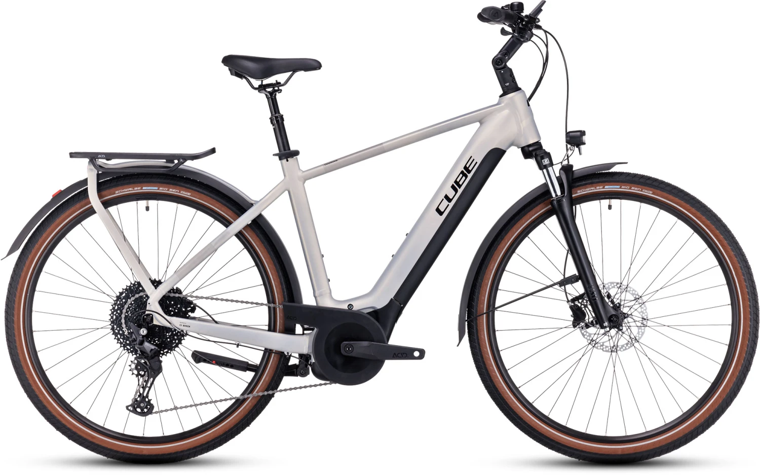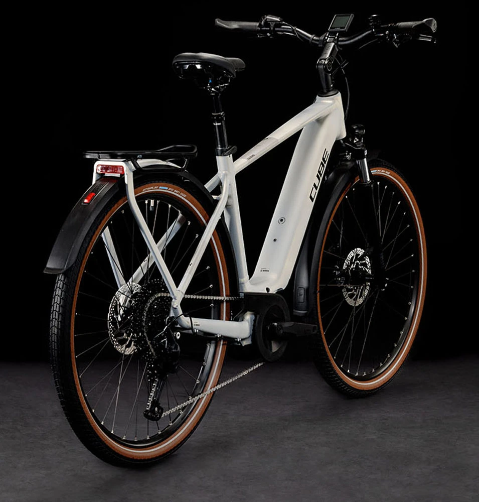 Bei der Entwicklung des Touring Hybrid standen Vielseitigkeit, einfaches Handling und hoher Fahrkomfort im Fokus. Also hat Cube den leistungsstarken Bosch Performance Motor mit Smart System und den PowerTube Akku so formschön ins Rahmendesign integriert, dass sie kaum auffallen. Was aber auffällt, ist der tolle Support im Vorwärts. Die überarbeitete Efficient Comfort Geometry sorgt gemeinsam mit der Federgabel mit 63 mm Federweg für ein komfortables und zugleich kontrolliertes Fahrgefühl, selbst auf holprigen Strecken. Auf dem elegant designten integrierten Gepäckträger IC 3.0 reist sämtliches Hab und Gut bequem und sicher von A nach B. Und in der Sattelklemme hat Cube ein praktisches Mini-Tool versteckt. Was noch? Ein neuer ACID Kettenschutz, ein Seitenständer und extralange Schutzbleche. Gut zu wissen: Den Rahmen gibt es als klassischen Herrenrahmen, Trapezrahmen oder Tiefeinsteiger – da ist für jeden die passende Version und Größe mit dabei!